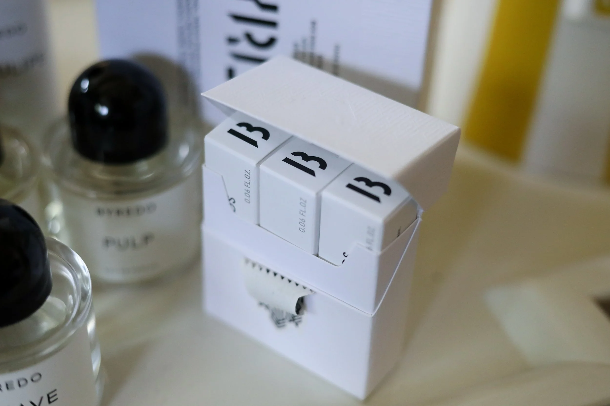 With my purchase I was given a 3 pack sampler that resembled a cigarette box . I was able to request three scents to sample and they came beautifully packaged with tissue paper and label. I was blown away that they put that much attention to detail just for the give away samples. I’m not sure if this is offered at department store counters; but the touch added to the pleasure of the actual Byredo store experience.